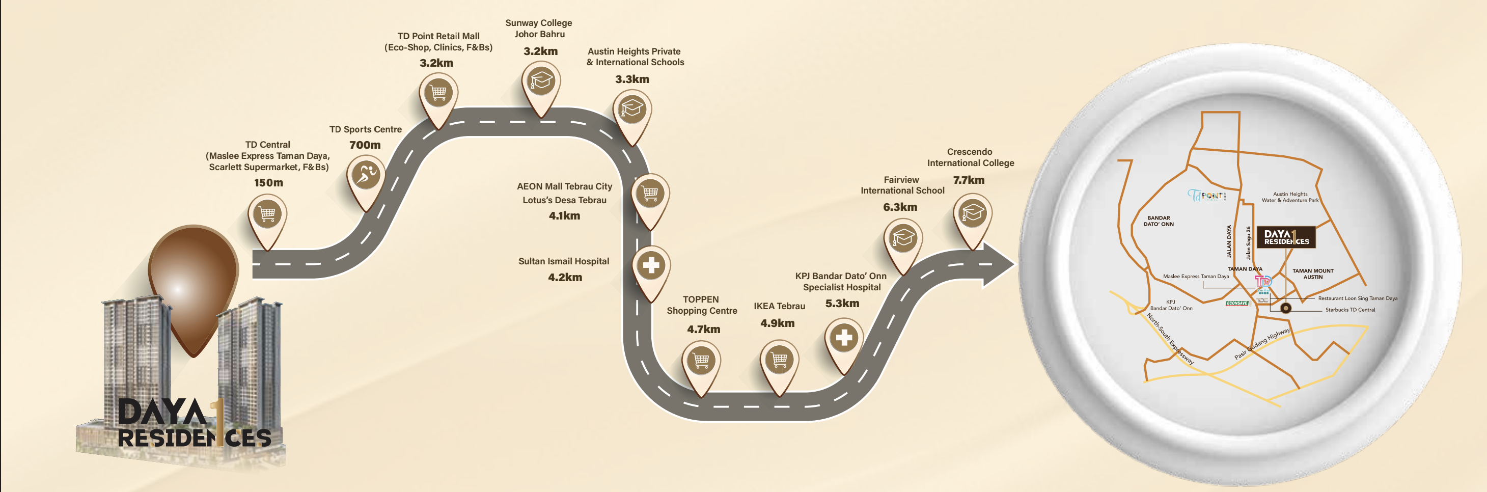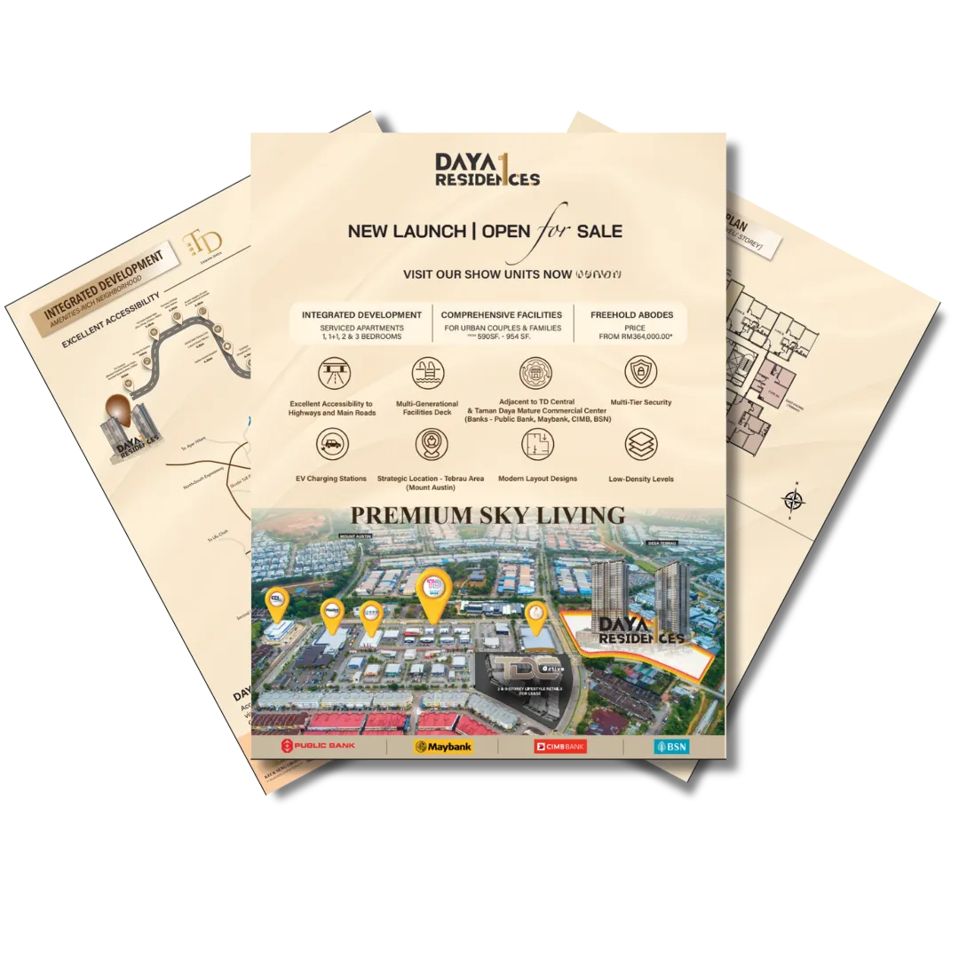 Nestled next to TD Central in vibrant Taman Daya, Daya 1 Residences offers a pioneering approach to urban high-rise living. Designed with modern flexibility in mind, it features a multi-generational facility deck complete with an indoor and outdoor gymnasium, a 50 m lap pool, splash pad, wading pool, jacuzzi, poolside cabana, and pavilion. Additional highlights include a forest-themed playground, reflexology trail, fitness station, maze garden, chess plaza, co‑working spaces, half basketball and pickleball courts, barbecue corners, and more—all within a secure, low-density environment with EV charging and tiered security.